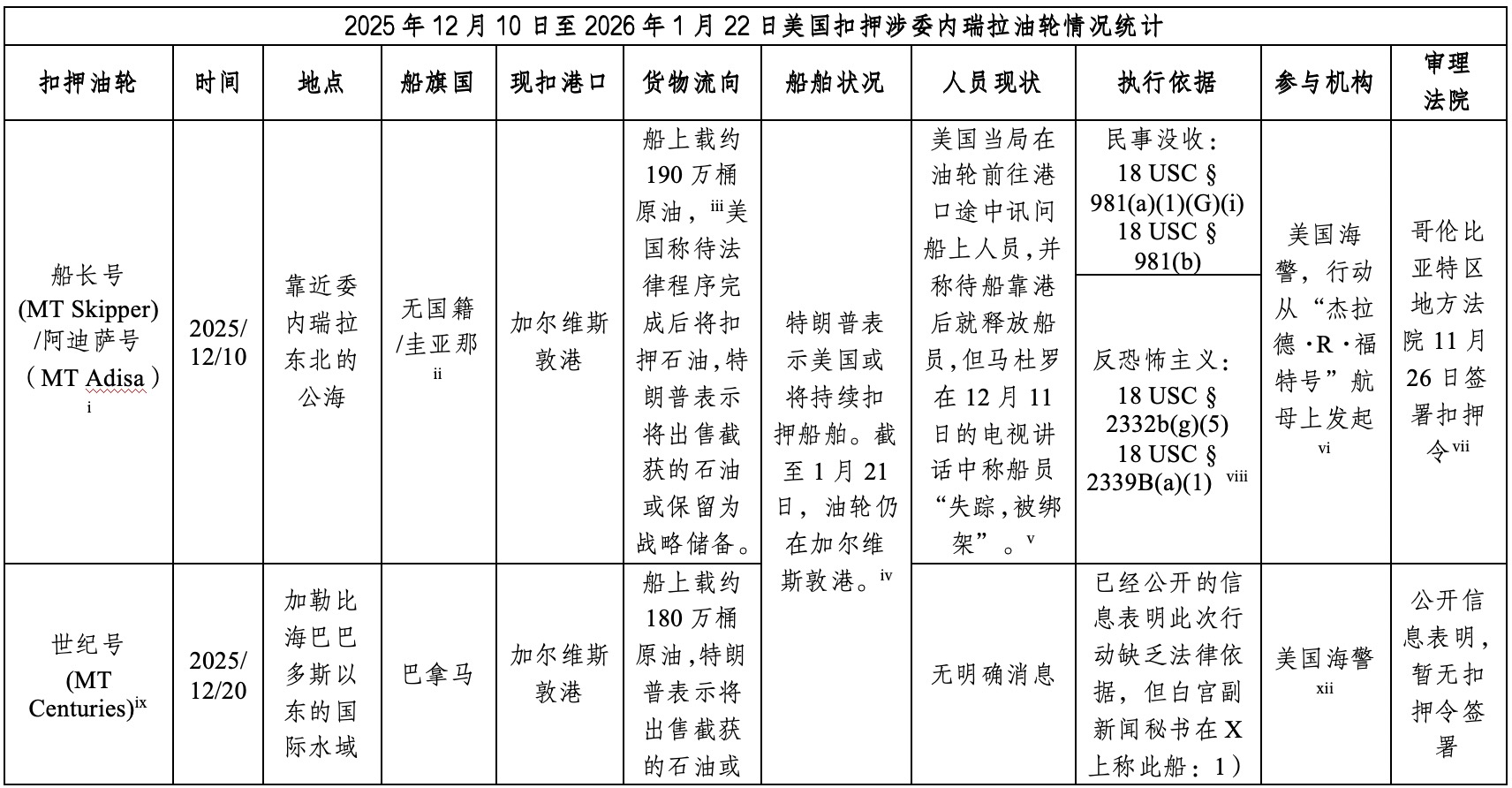 xxv “最终处置”见:Exclusive: US seizes Venezuela-linked, Russian-flagged oil tanker after weeks-long pursuit, <https://www.reuters.com/business/energy/us-seizing-venezuela-linked-oil-..., last accessed 30 January 2026;移交至委内瑞拉当局见:US handing over seized tanker to Venezuela, officials say, <https://www.reuters.com/world/americas/us-handing-over-seized-tanker-ven..., last accessed 30 January 2026.