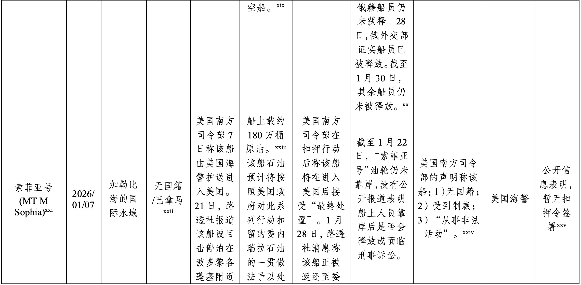 xxii Marine Traffic与路透社报道均称该船的船旗国系巴拿马,但美国南方司令部发文指称此船系“无国籍船”。巴拿马海事局于1月8日发表声明称其于2025年1月已经取消“索菲亚号”油轮的船旗。路透社报道见:Exclusive: US seizes Venezuela-linked, Russian-flagged oil tanker after weeks-long pursuit, <https://www.reuters.com/business/energy/us-seizing-venezuela-linked-oil-..., last accessed 30 January 2026;