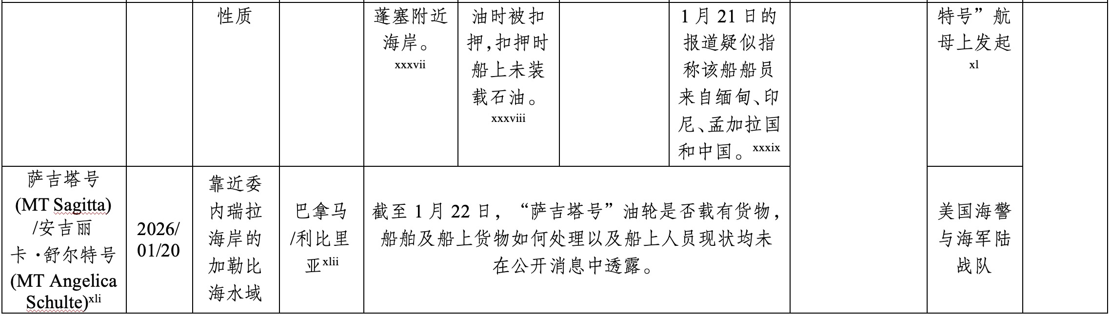 xli “萨吉塔号”油轮曾名“安吉丽卡·舒尔特号”,它的所有者是曾因与俄罗斯存在业务往来而受到美国制裁的香港公司Sunne Co. Limited,与“奥利娜号”油轮存在关联。详见:U.S. Forces Seize Sanctioned Tanker in SOUTHCOM, <https://news.usni.org/2026/01/20/u-s-forces-seize-sanctioned-tanker-in-s..., last accessed 30 January 2026.