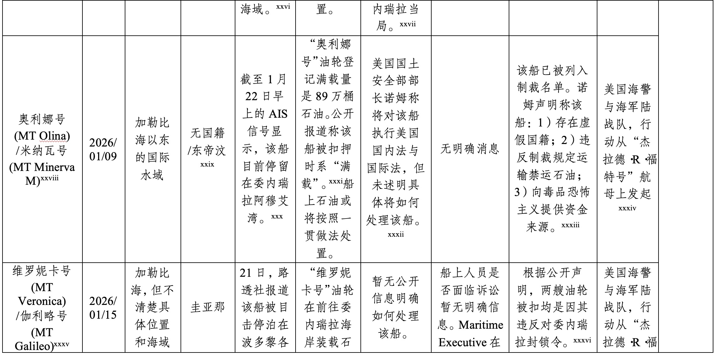 xxxi “奥利娜号”油轮满载为89万桶原油见:US military forces seize fifth tanker in effort to control Venezuelan oil, <https://www.theguardian.com/world/2026/jan/09/us-venezuela-oil-tanker-se..., last accessed 30 January 2026;该船被扣时为满载见:CNA, <https://www.facebook.com/ChannelNewsAsia/posts/the-olina-had-left-venezu..., last accessed 30 January 2026.