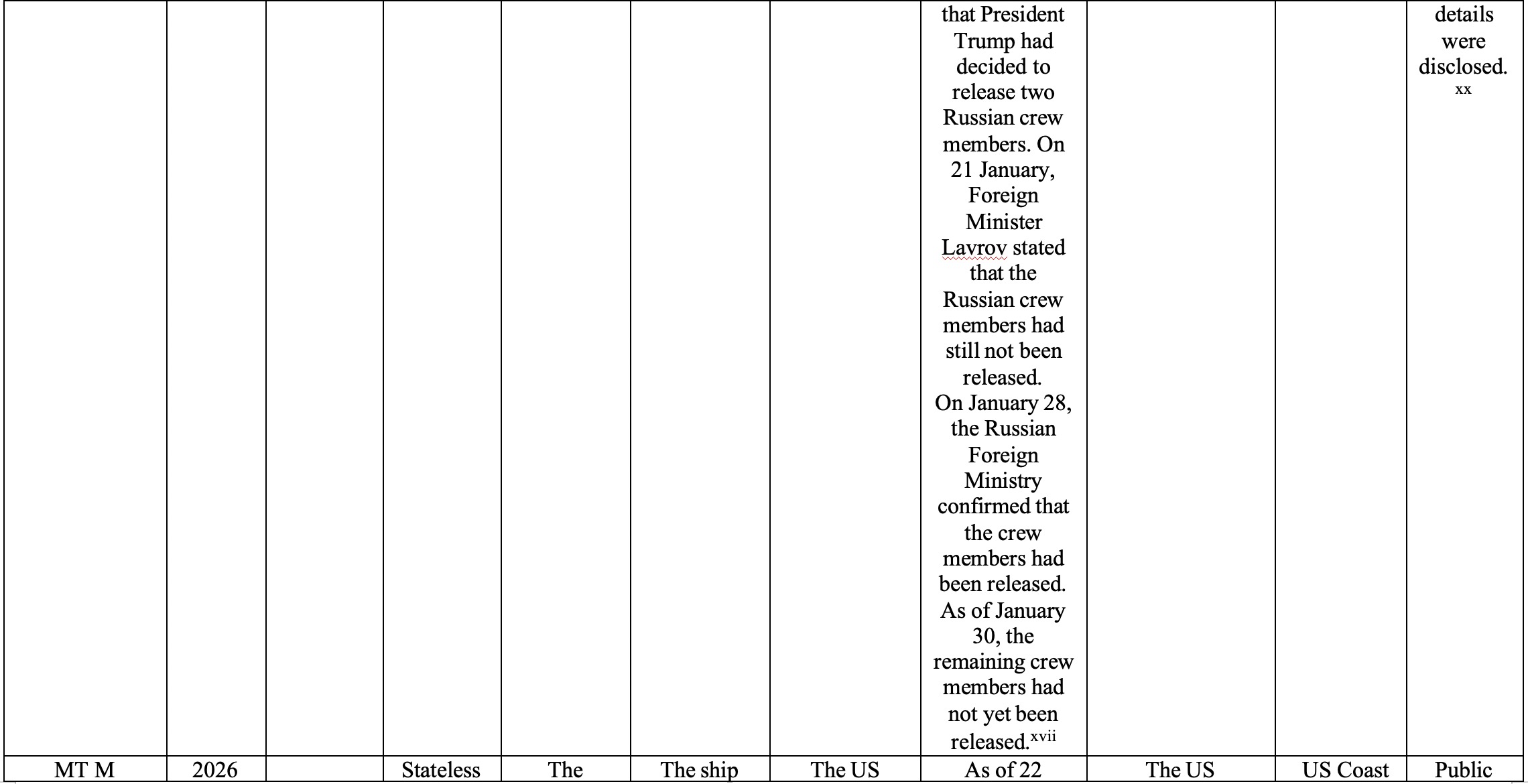 [22]US Coast Guard Requests Pastoral Support for Shadow Fleet Tanker’s Crew, <https://maritime-executive.com/article/us-coast-guard-requests-pastoral-..., last accessed 25 January 2026.